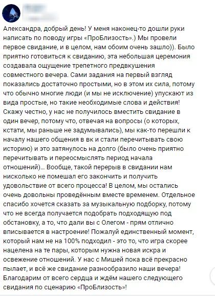 Игра "ПроБлизость" состоит из 5 интересных свиданий, благодаря которым вы станете друг другу еще ближе. Каждое свидание, это своего рода «сценарий/ план/инструкция» вечера. В котором прописаны интересные, «пикантные», сближающие вопросы и задания.